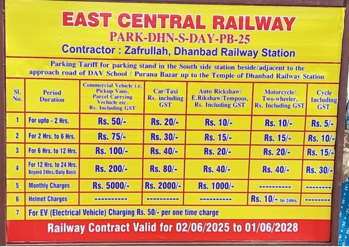 धनबाद डी ए वी स्कूल रोड में गाड़ी खड़ा करने का लगेगा पार्किंग धनबाद रेल मंडल की ओर से डी ए वी स्कूल...