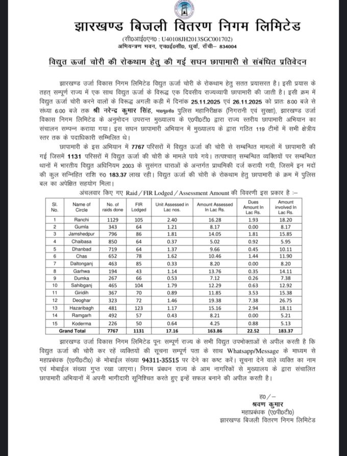 झारखंड में बिजली चोरी के खिलाफ चलाया गया राज्यव्यापी विशेष अभियान बेहद प्रभावशाली रहा। 25 और 26 नवंबर को सुबह 8 बजे से...