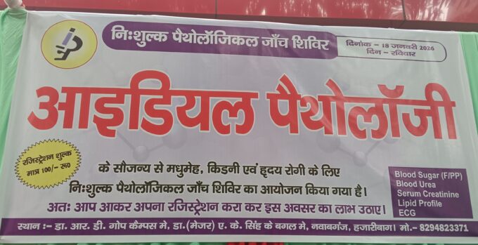 हजारीबाग के नवाबगंज रोड स्थित आइडियल पैथोलॉजी में रविवार को आयोजित निशुल्क पैथोलॉजिकल जांच शिविर स्वास्थ्य के क्षेत्र में एक प्रेरणादायक पहल बनकर...