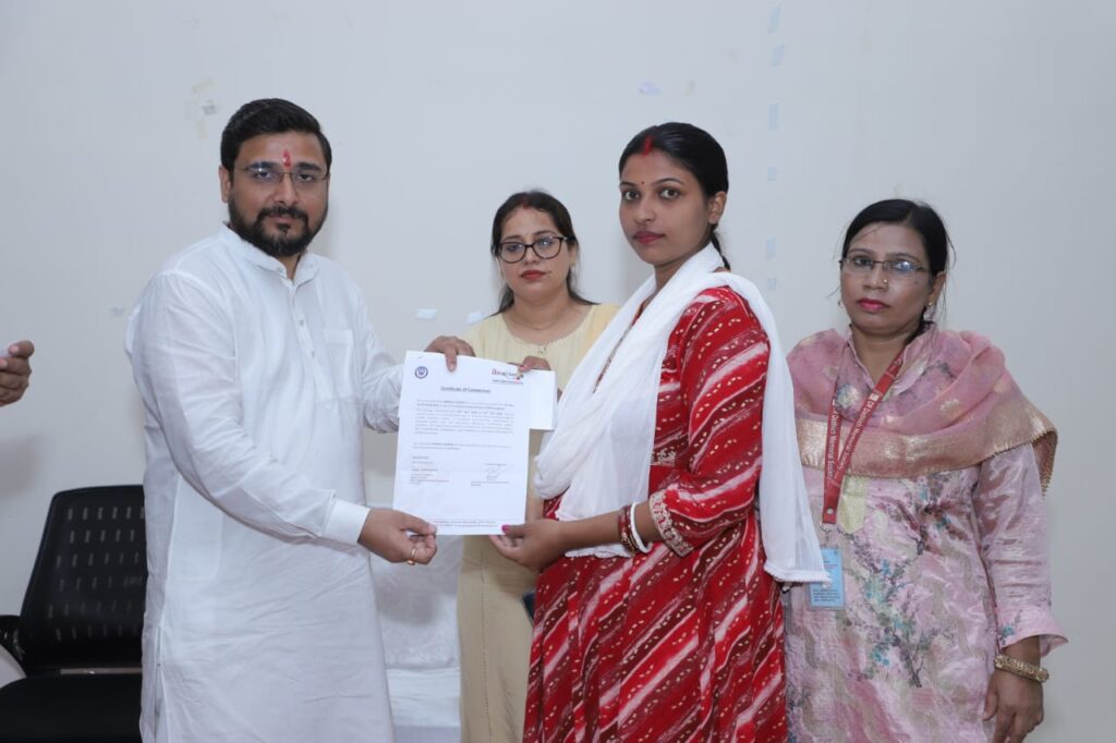 भाजपा नेता हर्ष अजमेरा ने शनिवार को अपने कार्यालय सभागार में प्रधानमंत्री कौशल विकास योजना के अंतर्गत प्रशिक्षित 60 बहनों को नर्सिंग ट्रेनिंग की सफल समाप्ति के उपरांत सम्मानित करते हुए सभी को प्रशस्ति पत्र सौंपा। इस महत्वपूर्ण अवसर पर एक विशेष कार्यक्रम आयोजित किया गया, जिसमें आरोग्यम अस्पताल की एडमिनिस्ट्रेशन जया सिंह,एचआर राजीव कुमार,नाज, नवीन चतुर्वेदी सहित कई गणमान्य व्यक्तियों ने भाग लिया।