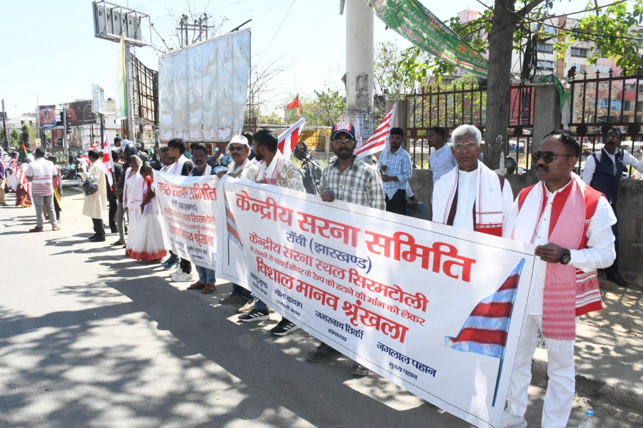 रांची | केन्द्रीय सरना समिति के अध्यक्ष श्री बबलू मुंडा की अगुवाई में केन्द्रीय सरना स्थल सिरमटोली के सामने फ्लाईओवर के रैम्प को हटाने की मांग को लेकर विशाल मानव श्रृंखला हरमू रोड श्रद्धानंद चौक से हरमू मैदान तक विभिन्न आदिवासी संगठनों द्वारा मानव श्रृंखला के कार्यक्रम में उपस्थिति दर्ज की। केन्द्रीय सरना समिति के अध्यक्ष श्री बबलू मुंडा ने कहा कि झारखंड के आदिवासी मुख्यमंत्री आदिवासी मामलों में आदिवासी मुख्यमंत्री सोया हुआ है।सिरमटोली फ्लाईओवर मामला में राज्य सरकार के मंत्री आदिवासी समाज को बरगलाने एवं झूठे वादे कर रहे हैं। हेमंत सरकार के अबुआ सरकार में सिर्फ बाबूआ का पूछ है। हेमंत सोरेन सरकार के द्वारा केन्द्रीय सरना स्थल से छेड़छाड़ करना आदिवासी समाज के साथ बहुत बड़ा आघात है। प्रकृति महापर्व सरहुल पर्व से पहले इस मामला को ठीक नहीं किया गया तो आने वाले दिनों में आदिवासी समाज आंदोलन करने पर बाध्य होगा जिसका जवाब देही राज्य सरकार की होगी। मुख्य पहान श्री जगलाल पहान ने कहा कि फ्लावर का रैंप को शीघ्र अति शीघ्र सरहुल महापर्व से पूर्व उसे फ्लावर रैम को हटा दिया जाए। ताकि शोभा जुलूस किसी तरह का आने-जाने में दिक्कत ना हो। भविष्य में आदिवासियों का किसी भी तरह का धार्मिक सामाजिक स्थलों को छेड़छाड़ ना करें सरकार । इस कार्यक्रम में मुख्य रूप से केन्द्रीय अध्यक्ष श्री बबलू मुंडा, मुख्य पहान श्री जगलाल पहान,महादेव टोप्पो, मुकेश मुंडा, राकेश मुंडा, अंजन मुंडा, आशीष मुंडा, हेमंत मुंडा, नरेश मुंडा, राजू पहान, मुन्ना हेमरोम, मनीष उरांव, रंजीत उरांव, संदीप उरांव, अक्षत हेमरोम, सुमित टोप्पो, आदि उपस्थित थे।