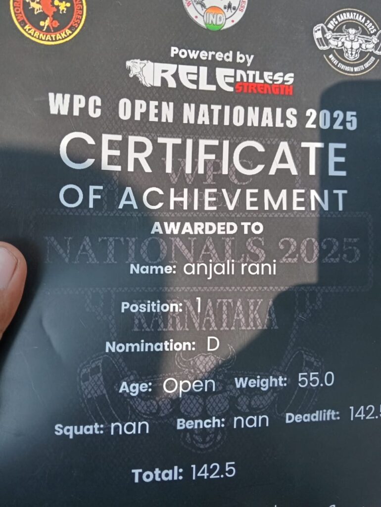 पतरातू प्रखंड के सरिया टोला में निवासी महेश प्रसाद की बेटी अंजली कुमारी ने पावर लिफ्टिंग चैंपियनशिप में 55.0 कैटेगरी में और अंजलि का वेट 82 और उन्होंने कुल 142.5 का वेट उठाया। जिस पर सरिया टोला के के ग्रामीण इसके उपलब्धि पर सहाराना कर रहे हैं। वही इस उपलब्धि पर उन्होंने अपने गुरु माता-पिता एवं चाचा को इस उपलब्धि का श्रेय का कारण बताया। उसका सपना है कि वह भारत देश के लिए पावर लिफ्टिंग खेलें ।
