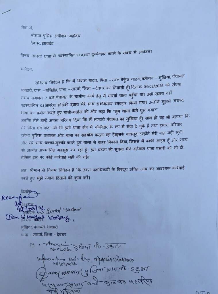 सारवां प्रखंड भण्डारो पंचायत के मुखिया बिमल यादव,ने सारवां थाना मे पदस्थापित SI पर दुर्व्यवहार करने का आरोप लगाया। उन्होंने पुलिस अधीक्षक को लिखित आवेदन मे कहा दिनांक 04/03/2026 को संध्या समय लगभग 7 बजे पंचायत के ग्रामीण कार्य हेतु मैं सारवां थाना पहुँचा था। उसी समय वहाँ पदस्थापित ऽ.। अमरेश सोलंकी द्वारा मेरे साथ अशोभनीय व्यवहार किया गया। उन्होंने मुझसे अशब्द आषा का प्रयोग करते हुए गाली-गलौज की और कहा की “तुम थाना कैसे घुस गया।जबकी मैंने उन्हें अपना परिचय दिया की मैं भण्डारो पंचायत का मुखिया हूँ।