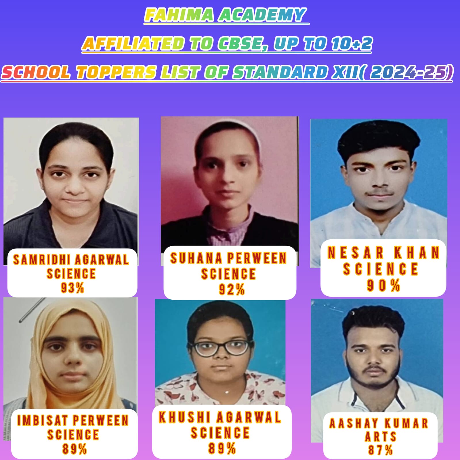 हजारीबाग के पगमिल स्थित फहिमा अकादमी स्कूल का सीबीएसई दसवीं एवं बारहवी बोर्ड परीक्षा मंगलवार को घोषित किया गया। विद्यालय का परीक्षा फल शत प्रतिशत रहा। परीक्षा फल पाकर सभी बच्चे काफी उत्साहित दिखे। बारहवी साइंस में समृद्धि अग्रवाल ने 93% लाकर स्कूल का नाम रोशन किया सुहाना परवीन ने 92% नेसार हसन ने 90% इंबिसत फातिमा ने 89% खुशी अग्रवाल ने 89 % और कला संकाय में आशय कुमार ने 87% अंक विद्यालय का नाम रोशन किया दसवीं में रौशन कुमार ने 93% लाकर विद्यालय प्रथम टॉपर बना, द्वितीय टॉपर स्वीटी गुप्ता 92% सुहेब सरवर 91% लवली भारती ने 90%कुमारी मधुबाला 89% लॉकर टॉपर बनी इसके अलावा अन्य बच्चों ने भी बेहतर प्रदर्शन किया। मौके पर सभी छात्र-छात्राओं व अभिभावकों को विद्यालय की प्राचार्या फरहा फातमी ने सर्वप्रथम सभी बच्चों के उज्जवल भविष्य की कामना करते हुए कहा कि विद्यालय का उद्देश्य गुणवत्ता पूर्ण शिक्षा देना है वहीं विद्यालय के बेहतरीन रिजल्ट के लिए बधाई दिए। मौके पर विद्यालय के विद्यालय के शिक्षक/शिक्षिका हसरत अली बेलाल अहमद राहुल कुमार कुणाल सिंह सोमनाथ कुमार इरशाद आलम मो सफ़ीक़ मनोज कुमार श्रवण कुमार राजन कुमार धर्मेंद्र यादव पल्लवी राणा माज़दा परवीन ने छात्र- छात्राओ को शुभकामनाएं एवं बधाइयां दिए। तथा उनके उज्जवल भविश्व की कामना की