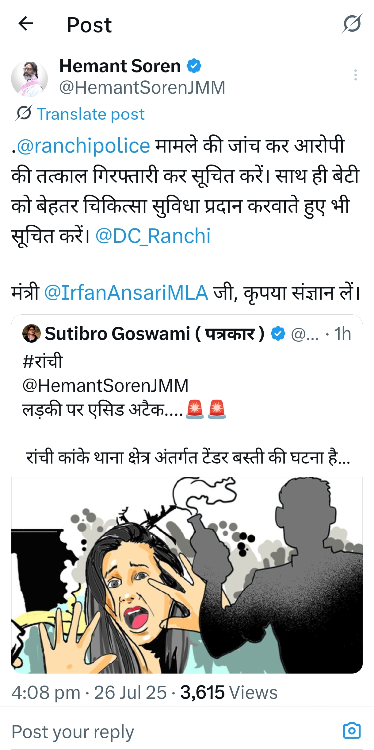 मुख्यमंत्री हेमंत सोरेन ने ट्वीट कर कहा कि मामले की जांच कर आरोपी की तत्काल गिरफ्तारी कर सूचित करें साथ ही बेटी को बेहतर चिकित्सा सुविधा प्रदान करवाते हुए भी सूचित करें ।
