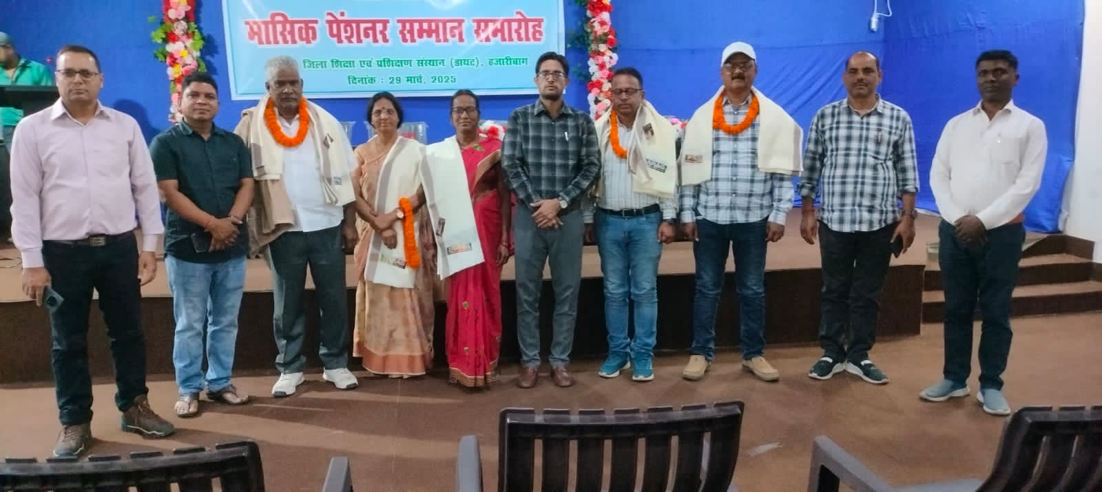 हजारीबाग: हजारीबाग में आज दिनांक 29/03/2025 को मासिक पेंशन सम्मान समारोह का आयोजन स्कूली शिक्षा एवं साक्षरता विभाग के तत्वाधान में श्री आकाश कुमार जिला शिक्षा अधीक्षक हजारीबाग की अध्यक्षता में किया गया. कार्यक्रम में सेवानिवृत्त शिक्षक / शिक्षिकाएं श्री अनिल कुमार पांडे मध्य विद्यालय खैराकरमा टाटीझरिया, श्री सरयू प्रसाद चौधरी राजकीय मध्य विद्यालय जरबा चूरचू, श्रीमती मंजू रानी उत्क्रमित मध्य विद्यालय बरगड्डा कटकमसांडी, श्री महेश्वर प्रसाद सिंह प्राथमिक विद्यालय मटवारी सदर,श्रीमती रेणु बाला प्राथमिक विद्यालय केसुरा सदर को जिला शिक्षा अधीक्षक महोदय द्वारा फूल माला पहनाकर एवं शाल ओढ़ाकर सम्मानित किया गया. कार्यक्रम को संबोधित करते हुए जिला शिक्षा अधीक्षक महोदय ने कहा कि विभाग शिक्षकों के सम्मान की बात हमेशा करता है और प्रयासरत है कि आपकी सारी कठिनाइयों का समाधान समय से किया जा सके. मैं हमेशा आपके साथ खड़ा हूं और किसी भी तरह के परेशानी होने पर आप मुझसे स्वयं संपर्क कर सकते हैं. सेवानिवृत्त शिक्षक श्री अनिल पांडे ने अपने संबोधन में कहा कि जिला शिक्षा अधीक्षक महोदय द्वारा आयोजित इस कार्यक्रम से काफी गौरांवित महसूस कर रहे हैं और महोदय का तहे दिल से बहुत-बहुत आभार प्रकट करते हैं. मौके पर श्रीमती मंजू रानी ने भी धन्यवाद व्यक्त किया. मंच संचालन डायट संकाय सदस्य श्री रंजीत कुमार वर्मा द्वारा किया गया. उक्त कार्यक्रम को सफल बनाने में श्री महेंद्र कुमार गुप्ता, अरविंद पाठक, अरविंद कुमार, अनिल कुमार, कल्याणी चौधरी,संजय कुमार, यमुना पांडे ने महत्वपूर्ण भूमिका निभाई.
