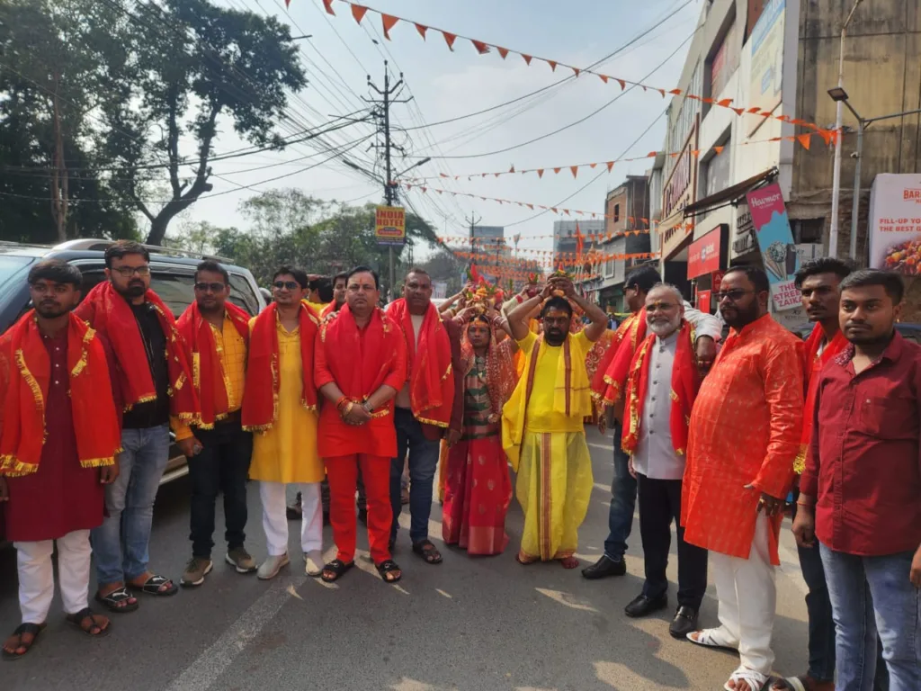 रांची :- श्री चैती दुर्गा मंदिर भुताहा तलाब का आठवां वार्षिक उत्सव दिनांक 20-02-2024 दिन मंगलवार सुबह 8:00 बजे कलश यात्रा निकाला गया। महोत्स्व के पहले दिन सुबह 5:30 बजे माता का पट खोला गया और उसके बाद सुबह 7:30 बजे माता की आरती की गयी। सुबह 9:30 बजे गाजे-बाजे के साथ कलश यात्रा निकाली गयी, जो महावीर चौक, गांधी चौक, शहीद चौक, शुभाष चौक त्रिकोण हवन कुंड से जल लेकर कचहरी रोड जयपाल सिंह स्टेडियम से होते हुए श्री चैती दुर्गा मंदिर प्रांगण पहुँचने पर कलश यात्रा लें कर आ रही महिलाओ पर मंदिर के पदाधिकारीओं एवं सदस्यों के द्वारा पुष्प वर्षा कर अभिनन्दन किया गया। पंडित सुभाष पाठक जी ने पूजा संपन्न करायी।उसके बाद गौरी गणेश पूजन,वेदी पूजन, आरती और पुष्पाजली हुई और भोग का प्रसाद वितरण किया गया। आठवां वार्षिकउत्सव के दूसरे दिन बुधवार कों सुबह 9 बजे माता का महा स्नान,दुर्गा अस्टमी पाठ,आरती एवं पुष्पाजलि होंगी और दोपहर 1 बजे से महा भंडारा एवं शाम 6:30 बजे महाआरती की जाएगी।