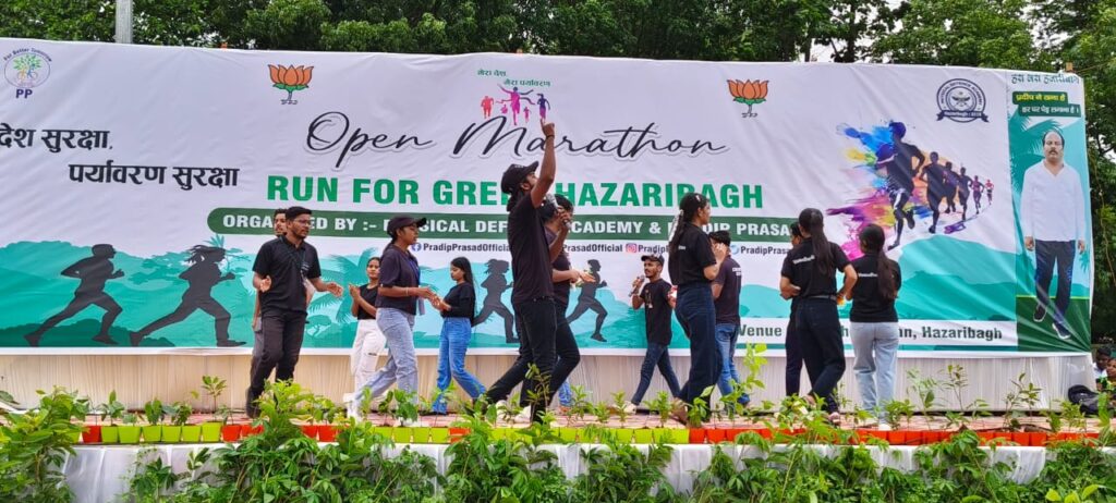 तो वहीं दूसरी और गांधी मैदान में स्थानीय कलाकारों के द्वारा झारखंडी नृत्य के साथ सांस्कृतिक कार्यक्रम पेश किया गया। पर्यावरण संरक्षण को लेकर नन्हे-नन्हे बच्चों ने संस्कृति कार्यक्रम प्रस्तुत करते हुए बेहतर संदेश दिया नुक्कड़ नाटक के जरिए पेड़ बचाओ अभियान पर जोर दिया गया। बोकारो, चतरा, रामगढ़, धनबाद,कोडरमा सहित अन्य कई जिलों से धावक हजारीबाग पहुंचे थे। इस कार्यक्रम में विशेष रूप से फिजिकल डिफेंस एकेडमी एवं शहर के समस्त खेल प्रेमियों का भरपूर सहयोग रहा। वही कार्यक्रम स्थल पर मौजूद करीब 10 हजार से अधिक लोगों के बीच पौधा का वितरण किया गया। हजारीबाग को हरा भरा बनाने का संकल्प लिया गया। आपको बता दे की समस्त धावकों के लिए गांधी मैदान में जलपान की व्यवस्था की गई थी, कार्यक्रम की समाप्ति के बाद भाजपा नेता प्रदीप प्रसाद ने अपने समर्थकों के साथ गांधी मैदान के आसपास क्षेत्र को बेहतर तरीके से सफाई किया।