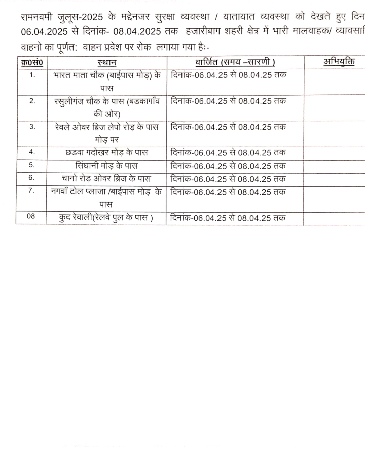 हजारीबाग:-रामनवमी जुलूस 2025 को लेकर प्रशासन ने सुरक्षा व्यवस्था व यातायात व्यवस्था को लेकर के विशेष तैयारी की है। भीड़-भाड़ व शांति व्यवस्था बनाए रखने के उद्देश्य से 06 अप्रैल से 08 अप्रैल तक हजारीबाग शहरी क्षेत्र में भारी मालवाहक एवं व्यावसायिक वाहनों के प्रवेश पर पूर्णतः रोक लगा दी गई है।जिला प्रशासन द्वारा जारी आदेश के अनुसार निम्नलिखित स्थानों पर भारी वाहनों के प्रवेश पर प्रतिबंध रहेगा