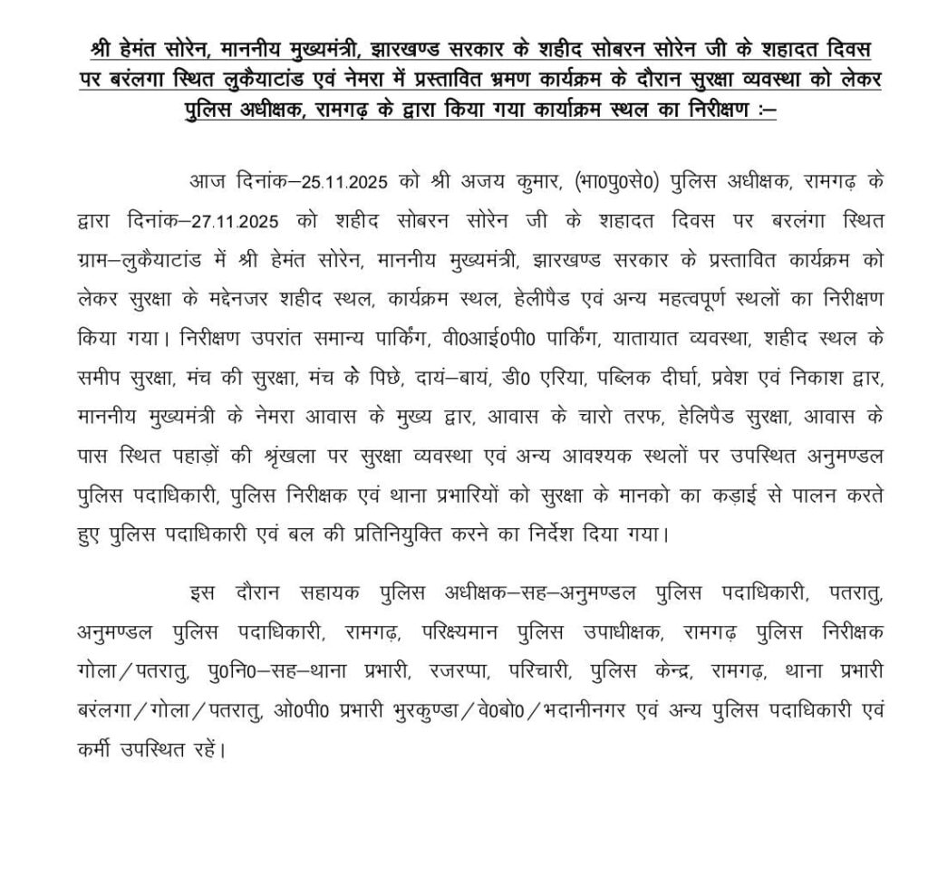 निरीक्षण उपरांत समान्य पार्किंग, वी०आई०पी० पार्किंग, यातायात व्यवस्था, शहीद स्थल के समीप सुरक्षा, मंच की सुरक्षा, मंच के पिछे, दायं-बायं, डी० एरिया, पब्लिक दीर्घा, प्रवेश एवं निकाश द्वार, माननीय मुख्यमंत्री के नेमरा आवास के मुख्य द्वार, आवास के चारो तरफ, हेलिपैड सुरक्षा, आवास के पास स्थित