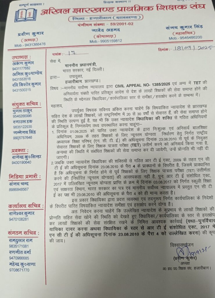 ज्ञापन में उल्लेख किया गया कि हाल ही में माननीय सर्वोच्च न्यायालय द्वारा सिविल अपील नंबर 1385/2025 एवं अन्य में टेट की अनिवार्यता संबंधी प्रतिकूल आदेश पारित किया गया है। इस आदेश से पूरे देशभर के लाखों कार्यरत शिक्षकों की सेवा संकट में पड़ गई है।