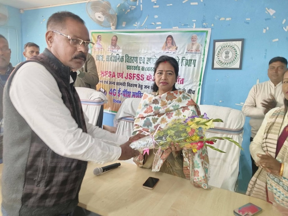 हमारी सरकार आम जनता के हितों और सुविधाओं के लिए निरंतर प्रतिबद्ध है।इसके उपरांत माननीय विधायक के कर-कमलों द्वारा पीडीएस डीलरों के बीच 4 जी ई-पॉश मशीनों का वितरण किया गया।कार्यक्रम में मुख्य रूप से प्रखंड खाद्य आपूर्ति पदाधिकारी अरविंद कुमार महतो, पूर्वी क्षेत्र के जिप सदस्य सरस्वती देवी, डीलर संघ के जिला अध्यक्ष अमरलाल महतो, प्रखंड अध्यक्ष दिगंबर महतो, कंप्यूटर ऑपरेटर नरेंद्र कुमार, डीलर विजय कुमार महतो, बजरंग कुमार महथा, हरिहर सिंह मुंडा, रमाशंकर महतो, बबलू महतो,शान्तो देवी,शकीला खातून, गिरिबाला देवी के अलावा क्षेत्र के कई डीलर एवं मुखिया सहित सैकड़ों लोग मौजूद थे।