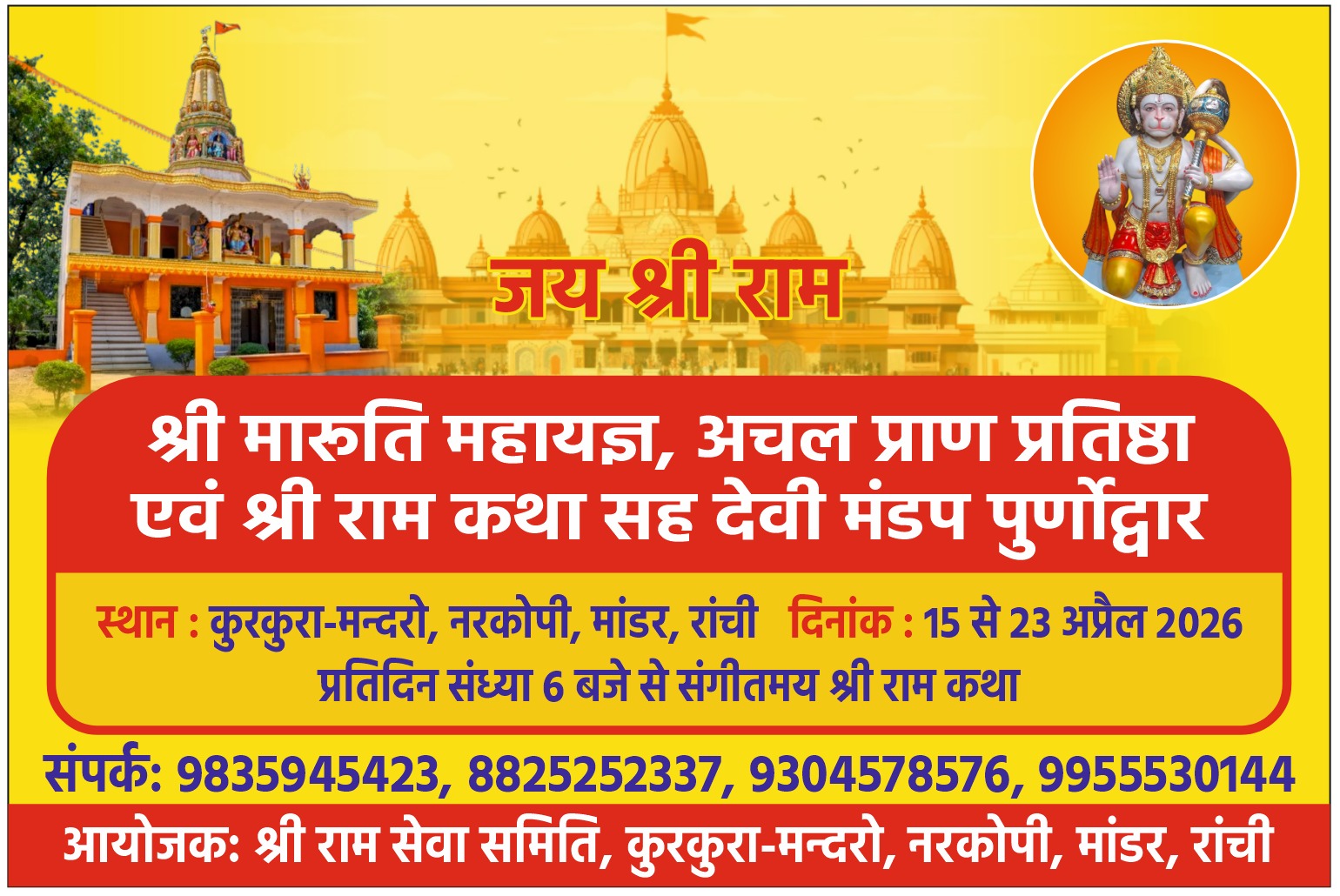 रांची। रांची के मांडर प्रखंड अंतर्गत कुरकुरा-मंदरो, नरकोपी क्षेत्र में आगामी 15 से 23 अप्रैल 2026 तक भव्य धार्मिक कार्यक्रम का आयोजन किया जा रहा है। इस अवसर पर श्री मारुति महायज्ञ, अचल प्राण प्रतिष्ठा एवं श्री राम कथा के साथ देवी मंडप पूर्णाहुति कार्यक्रम संपन्न होगा।