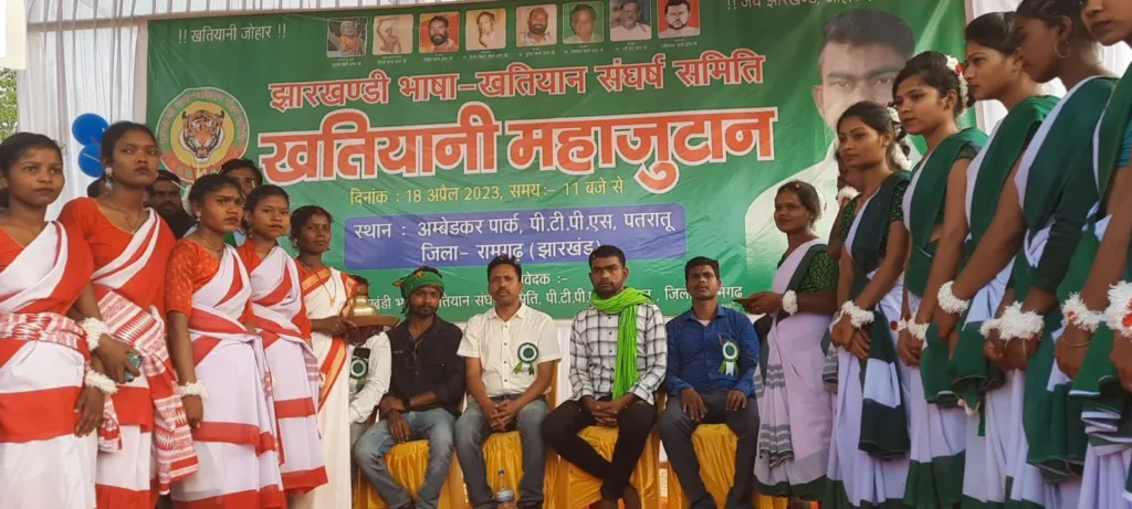 रामगढ़ जिले के पतरातु पीटीपीएस अंबेडकर पार्क स्थित आज झारखंडी भाषा खतियान संघर्ष समिति द्वारा खतियान महाजुटान को लेकर महासम्मेलन का आयोजन किया गया।इस कार्यक्रम में मुख्य अतिथि टाइगर जयराम महतो उपस्थित हुए वहीं मुख्य रूप धनंजय यादव समाजसेवी भुरकुंडा निवासी भी उपस्थित रहे।जिस बीच टाईगर जयराम महतो को झारखंडी सांस्कृतिक परंपरागत तरीके से स्वागत किया गया।