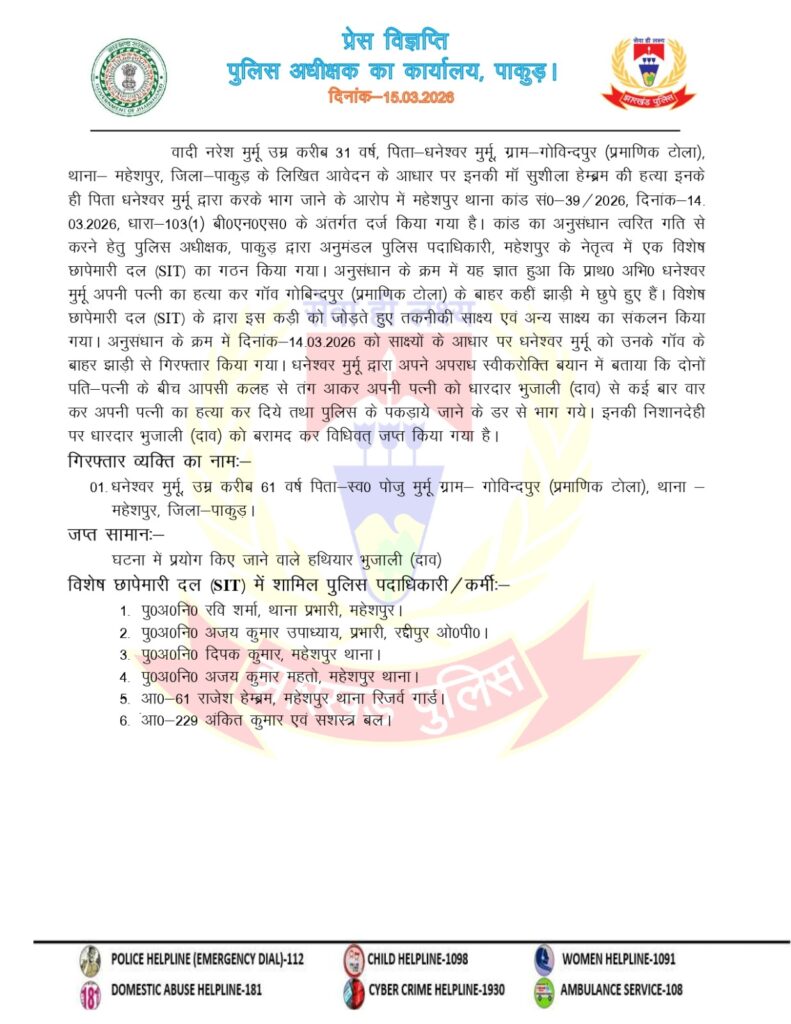 जानकारी के अनुसार मृतका के पुत्र नरेश मुर्मू (31) ने महेशपुर थाना में लिखित शिकायत दर्ज कराते हुए अपने पिता धनेश्वर मुर्मू पर मां सुशीला हेम्ब्रम की हत्या का आरोप लगाया। शिकायत के आधार पर महेशपुर थाना में कांड संख्या 39/2026, दिनांक 14 मार्च 2026 को धारा 103(1) बीएनएस के तहत प्राथमिकी दर्ज की गई।