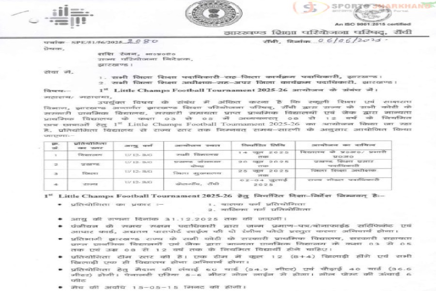 राज्य परियोजना निदेशक शशि रंजन द्वारा 6 जून को जारी पत्र के अनुसार, 8 से 12 वर्ष की उम्र के बच्चों (बालक व बालिका) के लिए लगभग 47 लाख रुपये की लागत से स्कूल, प्रखंड, जिला और राज्य स्तर पर प्रतियोगिता आयोजित की जाएगी। इसके तहत स्कूल स्तर पर प्रतियोगिता 14 जून से पहले, प्रखंड स्तर पर 20 जून से पहले और जिला स्तर पर 25 जून तक कराने की जिम्मेदारी तय कर दी गई है। राज्यस्तरीय प्रतियोगिता 2 से 4 मई तक रांची के मेगा स्पोर्ट्स कॉम्प्लेक्स के मुख्य स्टेडियम में होगी, जिसमें 24 जिलों की विजेता टीमें (बालक एवं बालिका) भाग लेंगी। प्रतियोगिता 60 गज × 40 गज के मैदान पर खेली जाएगी। गोल पोस्ट की ऊंचाई 6 फीट होगी और हर टीम में 8 खिलाड़ी मैदान पर होंगे जबकि 4 खिलाड़ी रिजर्व में रहेंगे।