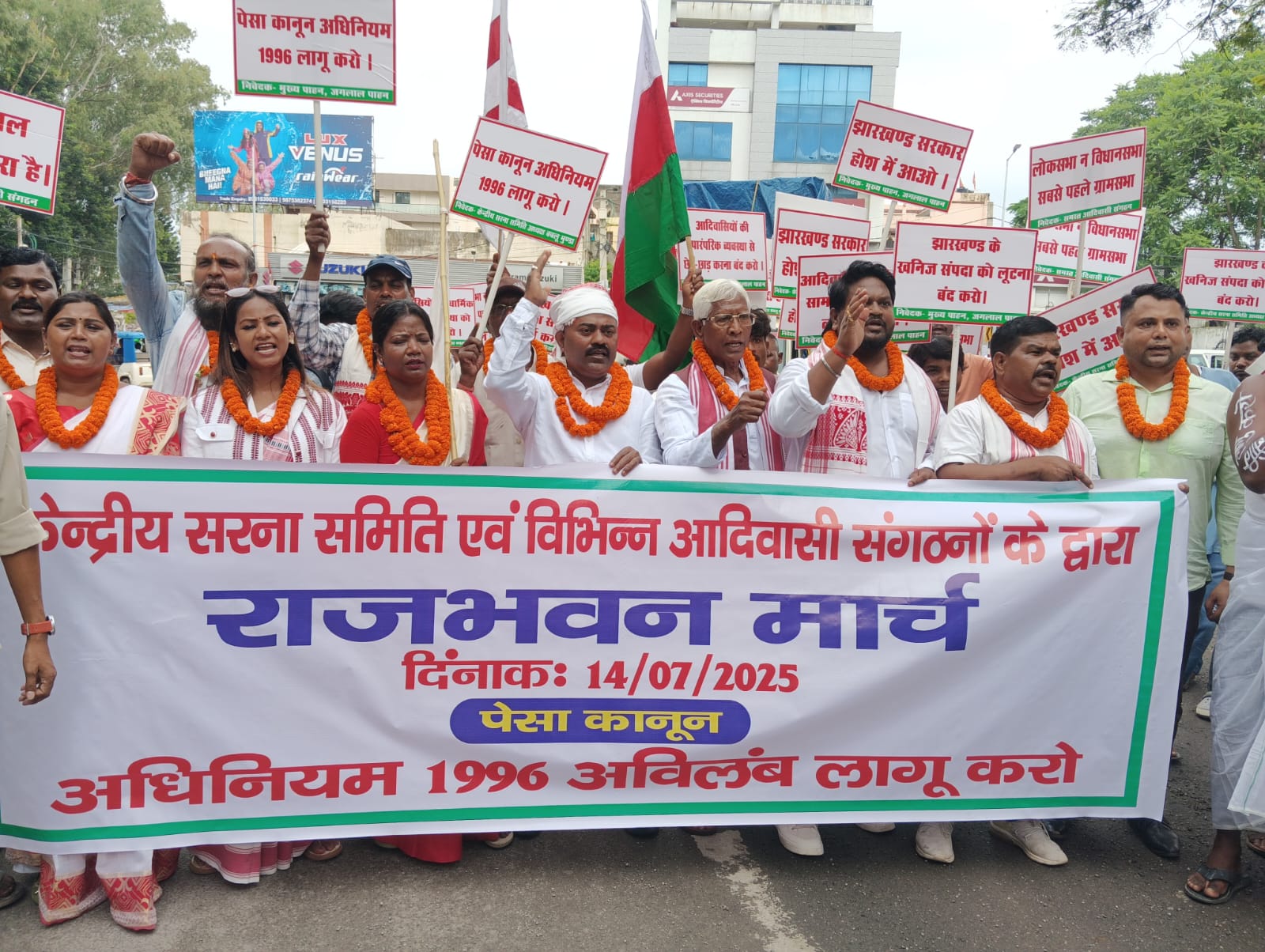 पूर्व घोषित चार दिवसीय कार्यक्रम के अनुसार दिनांक 11/7/2025 को गुमला जिला के लिटा टोली से पंखराज बाबा कार्तिक उरांव के जन्म स्थल से नमन करते हुए निशा भगत के अगुवाई में सिसई, भरनो, बेड़ो, कटहल मोड़, होते हुए दिनांक 13/7/2025 को रात्रि में रांची के आईटी आई बजरा पहुंचा। दिनांक 14/7/2025 को केन्द्रीय सरना समिति के अध्यक्ष श्री बबलू मुंडा के अगुवाई में विभिन्न आदिवासी, धार्मिक सामाजिक संगठनों के सैकड़ों कार्यकर्ताओ ने आईटी आई बजरा पहुंच कर गुमला से पदयात्रा कर रांची पहुंचने वाले सभी आदिवासी अगुवाओं का फुल माला एवं अंगवस्त्र देकर उनका गर्म जोशी के साथ स्वागत किया। पुनः केन्द्रीय सरना समिति के नेतृत्व में श्री बबलू मुंडा की अगुवाई में आई.टी.आई. बजरा से राजभवन मार्च किया गया और पेसा कानून अधिनियम 1996 को अविलम्ब लागु करने को लेकर महामहिम राज्यपाल महोदय को माँग पत्र सौपा गया। केन्द्रीय सरना समिति के अध्यक्ष श्री बबलू मुंडा ने कहा कि पेसा कानून अधिनियम 1996 को क्यों लागु करने की माँग की जा रही है क्योंकि इस पेसा कानून से आदिवासी समाज के एवं झारखण्ड के विभिन्न जिलों के पाहन,पईनभोरा,कोटवार, महतो, मानकी मुण्डा, बैगा आदि जैसे लोगों को मिलने वाले अधिकार संरक्षित हो सके। *श्री बबलू मुंडा ने कहा कि पेसा कानून अधिनियम 1996पेसा कानून पंचायत अनुसूचित क्षेत्रों में विस्तार अधिनियम 1996 भारत में अनुसूचित क्षेत्रों पांचवीं अनुसूची में रहने वाले आदिवासी समुदायों को स्वशासन और उनके प्राकृतिक संसाधनों पर अधिकार प्रदान करने के लिए बनाया गया है। यह कानून 24 दिसंबर 1996 को लागू हुआ और इसका उद्देश्य ग्राम सभाओं को सशक्त बनाना आदिवासियों के पारंपरिक अधिकारों की रक्षा करना और जल जंगल जमीन जैसे संसाधनों पर उनके नियंत्रण को सुनिश्चित करना है। यह कानून संविधान के अनुच्छेद 243 M के तहत संसद द्वारा पारित किया गया और हेमंत सोरेन सरकार आदिवासियों की परंपरागत व्यस्था को नष्ट करने में लगी हैं। एक विशेष समुदाय को लाभ पहुंचाने के लिए, आदिवासियों की धर्म संस्कृति रीति रिवाज रुढ़िवादी प्रथा को खत्म करना चाहती है इसलिए हेमंत सोरेन सरकार झारखंड में पेसा कानून अधिनियम 1996 लागू नही कर रही हैं। *मुख्य पहान श्री जगलाल पहान ने कहा कि* पेसा अधिनियम 1996 में 23 प्रावधान और अधिनियम में कुल 17 धाराएँ हैं इसके अंतर्गत विभिन्न प्रावधान ग्राम सभाओं और पंचायतों को शक्तियाँ प्रदान करते हैं