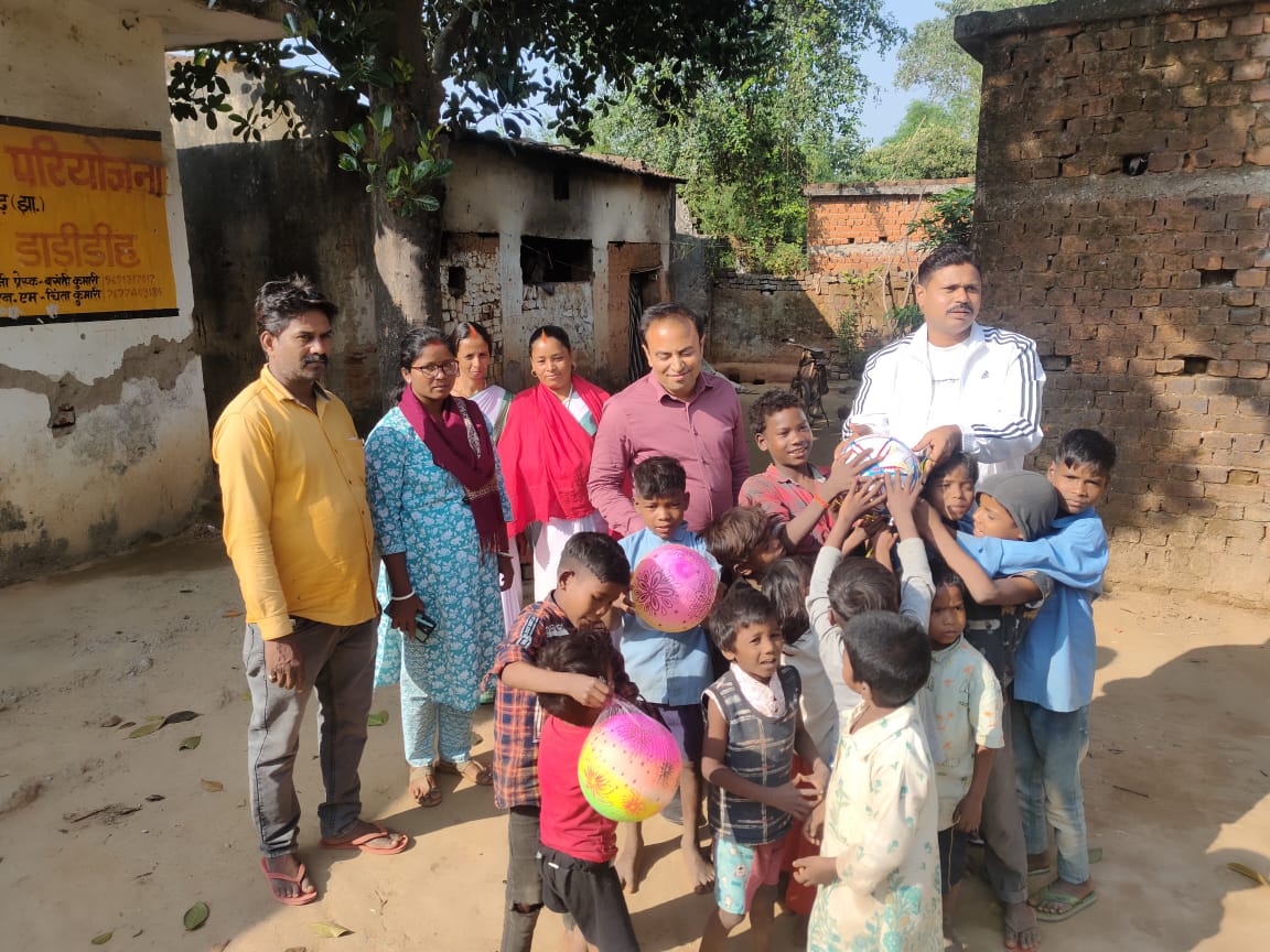 बिरहोर कॉलोनी में समाजसेवी जयप्रकाश सिंह ननकी ने खेल सामग्री का वितरण किया।