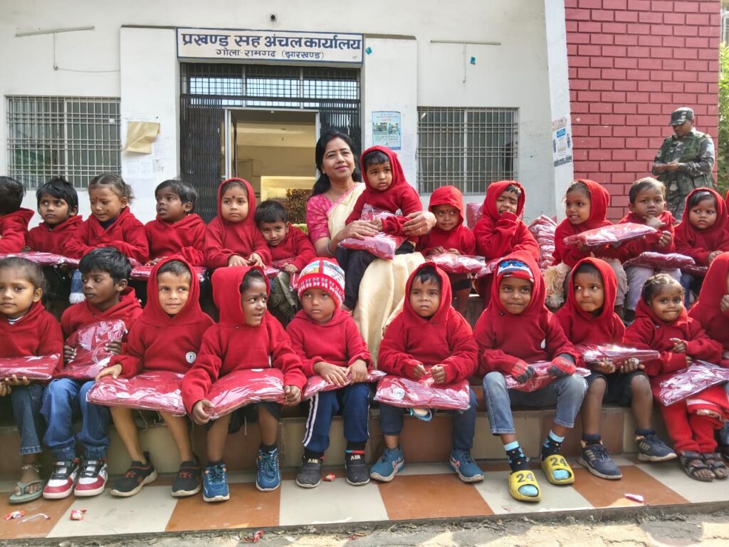 गोला प्रखंड परिसर में आंगनबाड़ी के बच्चों के बीच स्वेटर का किया गया वितरण