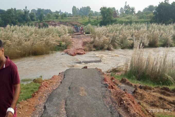 देवघर-चितरा मुख्य मार्ग पर मंगलवार रात भारी बारिश के बाद दक्षिणबहाल पुल के पास बना अस्थायी रास्ता धंस गया, जिससे एक वैगन आर...