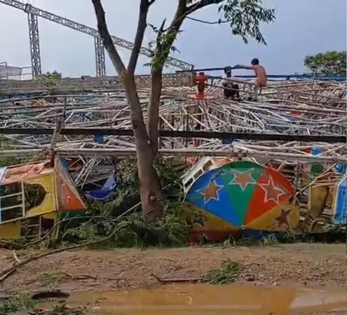 रांचीः राजधानी में बड़ा हादसा हुआ। मेले में लगा हुआ झूला गिरा गया। इसके बाद मेला और उसके आसपास अफरातफरी की स्थिति हो गई।मिली जानकारी के अनुसार, रांची के कांटाटोली इलाके में स्थित हाईटेंशन ग्राउंड में मेले के दौरान सबसे बड़ा झूला अचानक गिर गया। हालांकि इस हादसे में अभी तक किसी जान-माल के नुकसान की सूचना नहीं मिली है। बताया जा रहा है कि रांची में आये तेज आंधी बारिश की चपेट में मेला का झूला आ गया और अचानक झूला जमीन पर गिर गया। हादसे के बाद मेले में अफरातफरी की स्थित बन गई। मेले स्थल के पास से गुजर रहे लोग झूले को जमीन पर इस तरह से गिरा हुआ देख हैरान हो गये।
