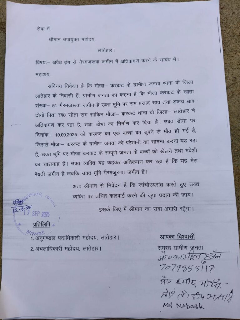 लातेहार। मौजा करकट के ग्रामीणों ने उपायुक्त लातेहार को आवेदन देकर गंभीर आरोप लगाया है कि गांव के ही राम प्रसाद साव एवं अजय साव, पिता स्व. सीताराम साव ने खाता संख्या-51 की गैरमजरूआ जमीन पर अवैध रूप से दोबारा अतिक्रमण कर डोभा का निर्माण कर दिया है। ग्रामीणों का कहना है कि इस डोभा में 10 सितंबर को गांव के एक मासूम बच्चे की डूबने से मौत हो गई, जिससे पूरे इलाके में आक्रोश और शोक का माहौल है।