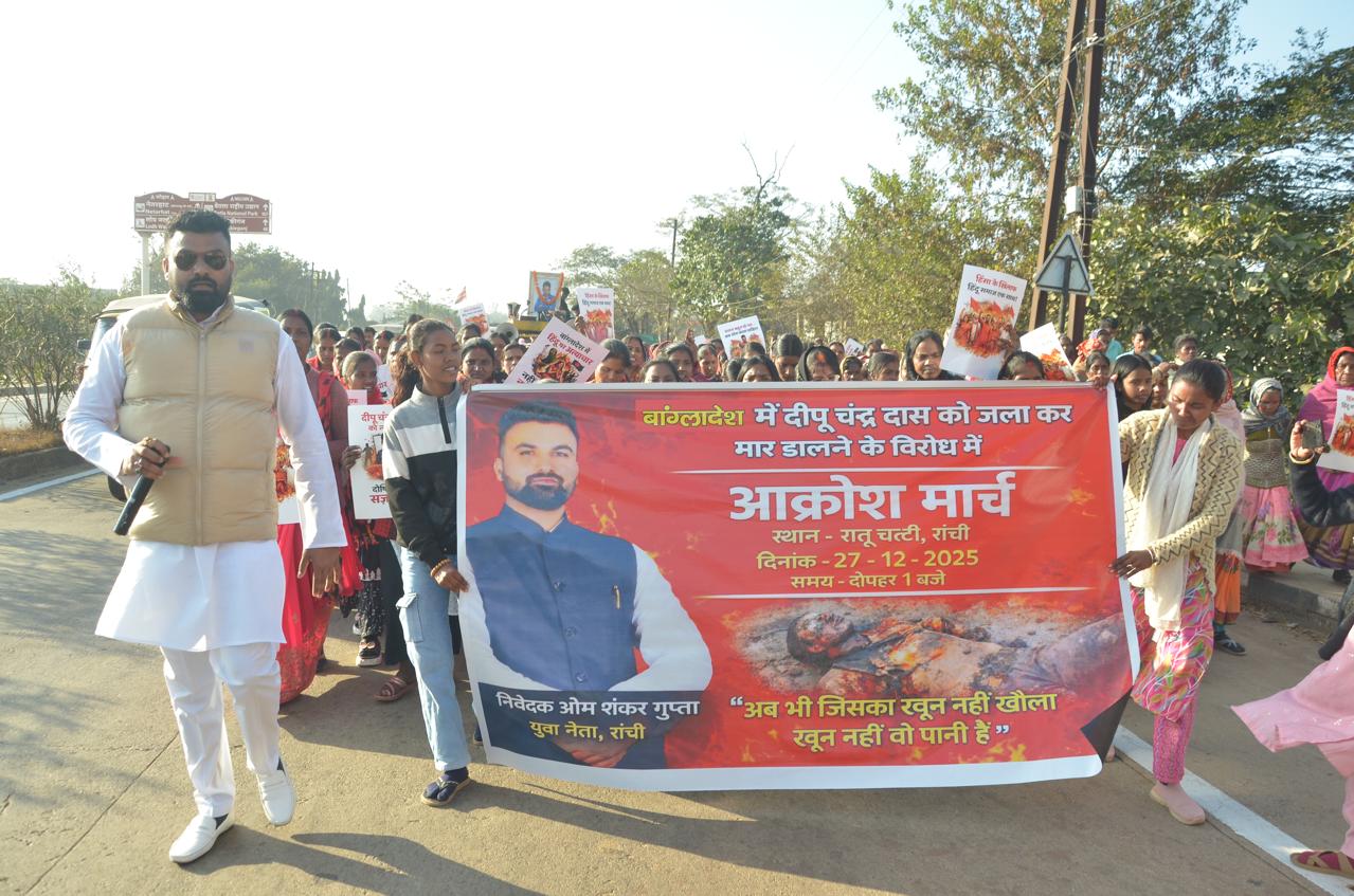 रातू (रांची): बांग्लादेश में हिंदू अल्पसंख्यकों पर हो रहे लगातार अत्याचार और हाल ही में दीपू चंद्र दास की नृशंस हत्या के विरोध में शनिवार को रातू की सड़कों पर जनाक्रोश फूट पड़ा। युवा नेता ओम शंकर गुप्ता के नेतृत्व में निकाले गए इस आक्रोश मार्च में समाज के हर वर्ग — युवा, महिलाएं, बुजुर्ग और सामाजिक कार्यकर्ता — बड़ी संख्या में शामिल हुए।