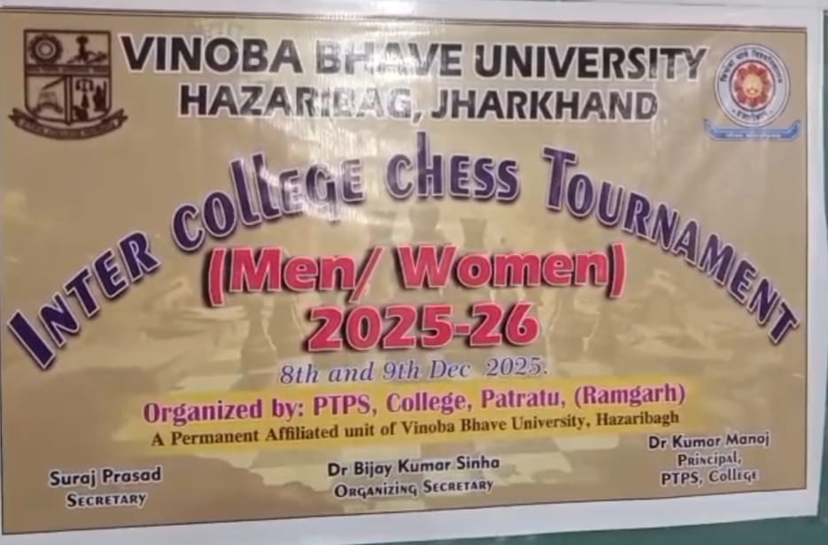 पतरातू । पीटीपीएस कॉलेज पतरातू में सोमवार को दो दिवसीय विनोबा भावे विश्वविद्यालय इंटर कॉलेज शतरंज प्रतियोगिता 2025- 26 का शुभारंभ किया गया। प्रतियोगिता का उद्घाटन मुख्य अतिथि कॉलेज शासी निकाय के सचिव सूरज प्रसाद और कॉलेज के प्राचार्य डॉ कुमार मनोज ने दीप प्रज्वलित कर किया।