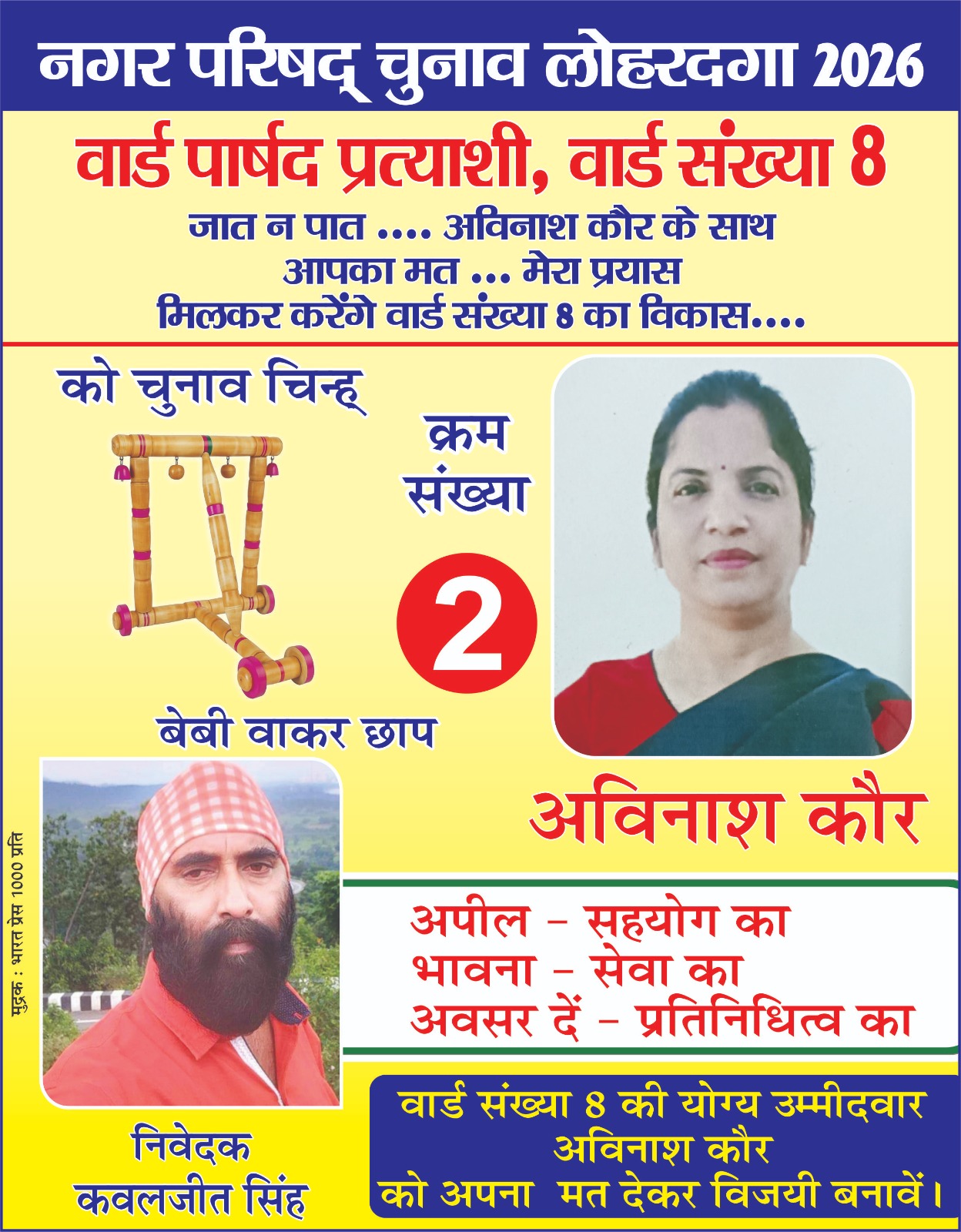 लोहरदगा : नगर परिषद चुनाव को लेकर शहरी क्षेत्र के वार्ड संख्या 8 में चुनावी सरगर्मी तेज हो गई है। वार्ड संख्या 8 से चुनाव चिन्ह बेबी वॉकर और क्रम संख्या 2 की प्रत्याशी अविनाश कौर ने क्षेत्र में जनसंपर्क अभियान चलाकर मतदाताओं से अपने पक्ष में मतदान करने की अपील की। इस दौरान उन्होंने वार्ड के विभिन्न मोहल्लों में घर-घर जाकर लोगों से मुलाकात की और उनकी समस्याओं को ध्यानपूर्वक सुना। अविनाश कौर ने मतदाताओं से कहा कि वार्ड संख्या 8 को भ्रष्टाचार मुक्त और विकासशील वार्ड बनाने के लिए निरंतर प्रयास किया गया है।